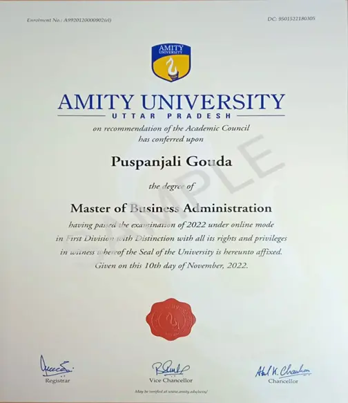 Amity University Online MBA program is completely accredited and honoured by leading public and transnational education authorities, icing both credibility and global acceptance of your degree.