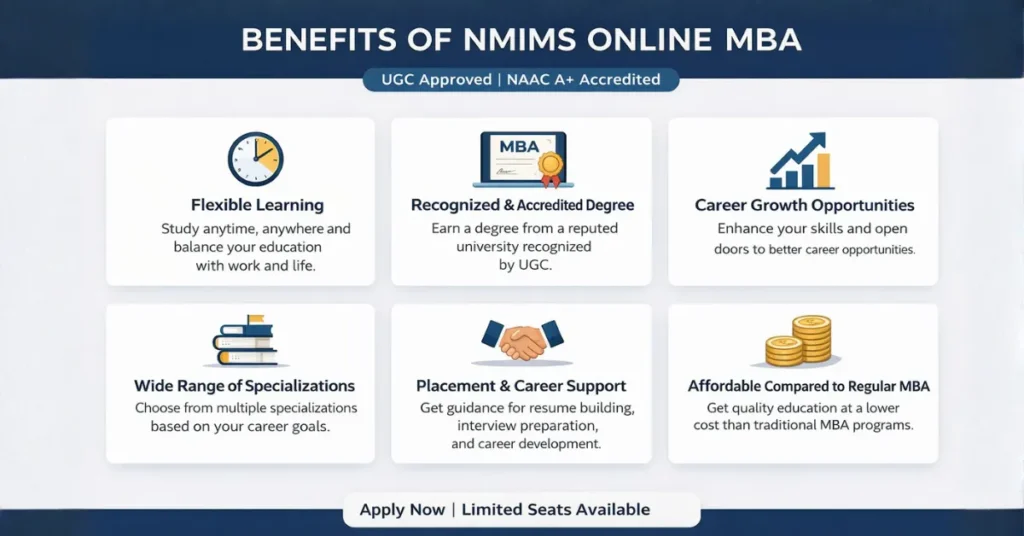 The NMIMS Online MBA offers a wide range of benefits for students, working professionals, and entrepreneurs who want to enhance their skills and advance their careers. With a strong focus on flexibility, quality education, and industry relevance, this program provides real value in today’s competitive job market.